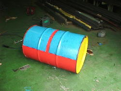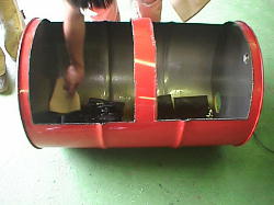 | photo 1.Use two drums. | photo 2.Drill hole (9 cm diameter) for exhaust chimney. | photo 3.View of exhaust hole (9 cm diameter) | ||