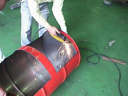 | Photo 7. Hot air passageway is cut. | Photo 8. Two drum cans are welded together. | Photo 9. Put in metal grating. | ||