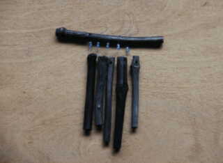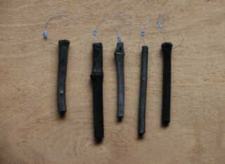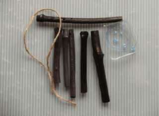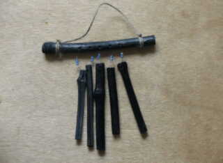 | 材料の用意をします。 釣り糸 太さは適当です。 横にする竹炭 長さ15センチ位 1本 音を出す竹炭 長さ10センチくらい 5本 釣り糸は20センチを5本と麻糸30pを1本 ビーズ10個 用意します。 |